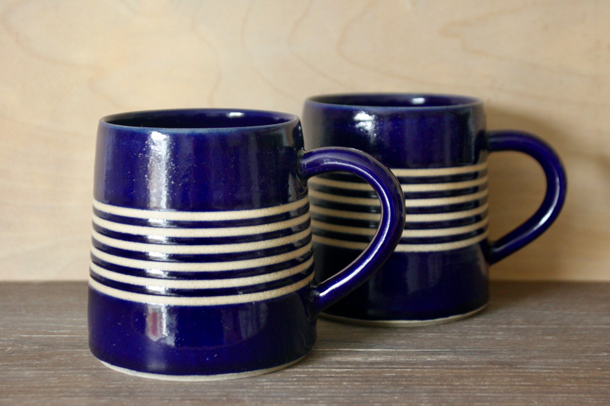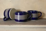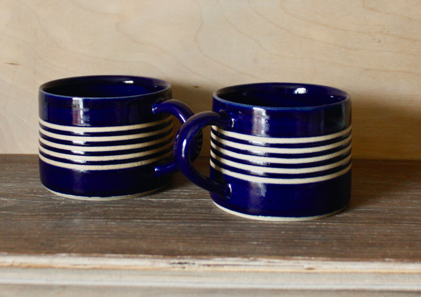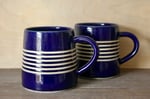 Wheel-thrown mug in smooth white stoneware, decorated with a glossy blue glaze and bare clay stripes.