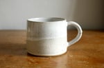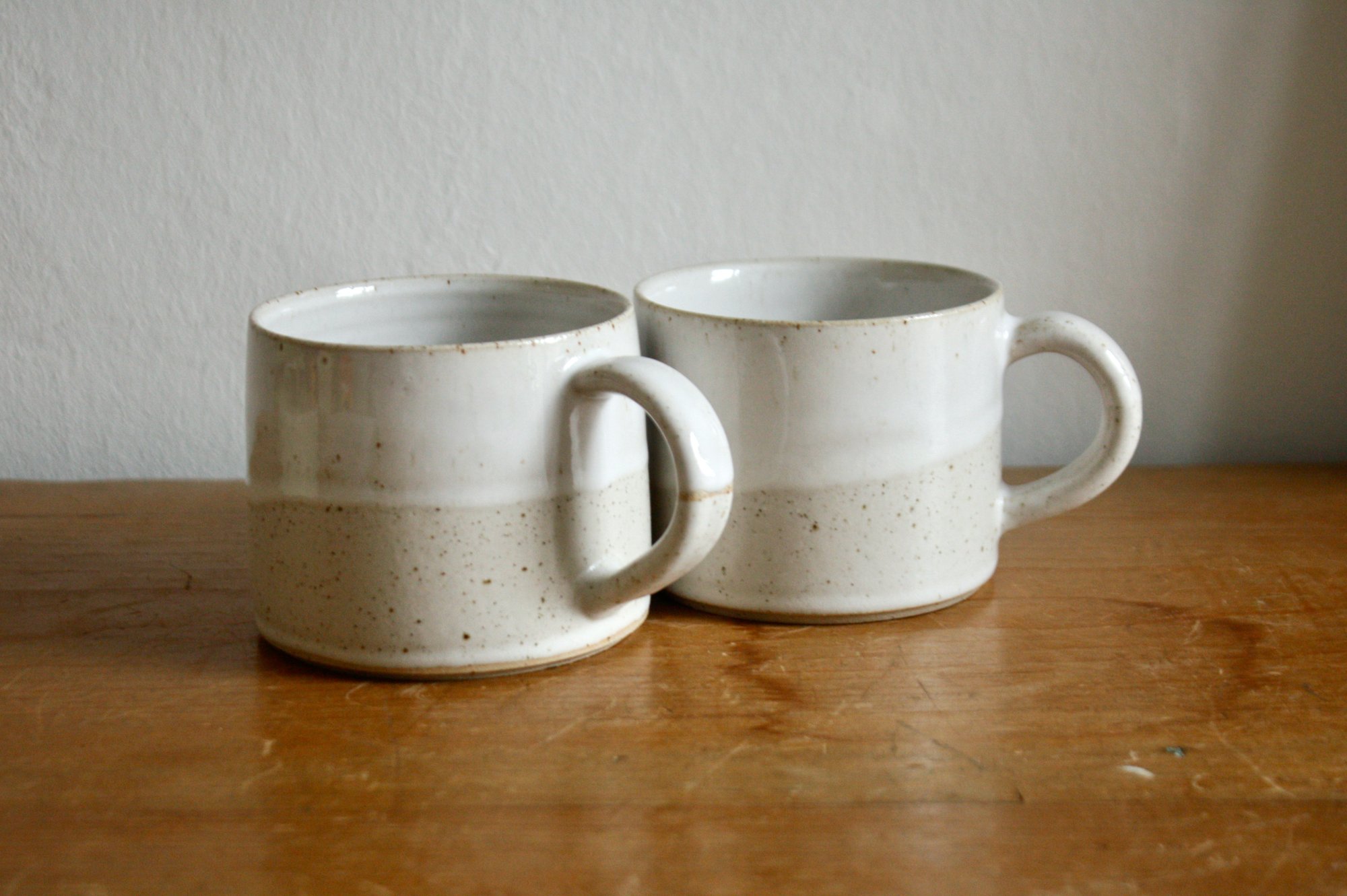 Hand-thrown flecked white stoneware mug finished in a glossy white glaze inside and both glossy and satin white outside.